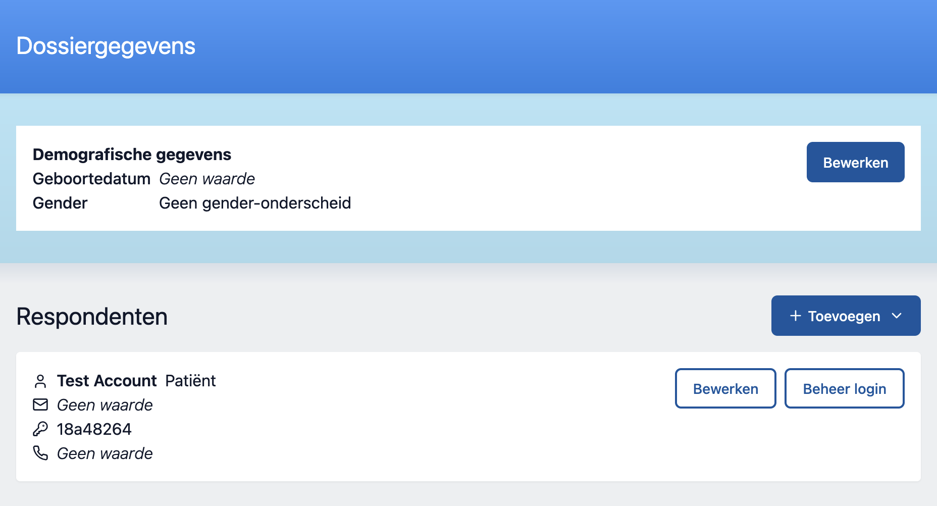 Voordat een respondent toegang kan krijgen, moet deze eerst een account toegediend krijgen van een behandelaar. Hieronder wordt uitgelegd hoe je als behandelaar een account kan aanmaken voor een respondent. Dit is op dit moment nog een beetje complex in verband met de veiligheid en de mogelijkheden van ons systeem, hiervoor onze excuses.