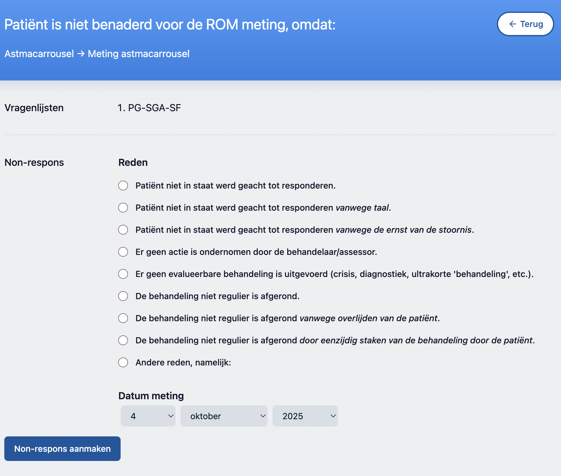 Selecteer de reden voor non-respons en klik op "Non-respons aanmaken". Wanneer de non-respons gaat over een meting uit het verleden, kan de datum van non-respons opgegeven worden onder het kopje "Datum Meting".