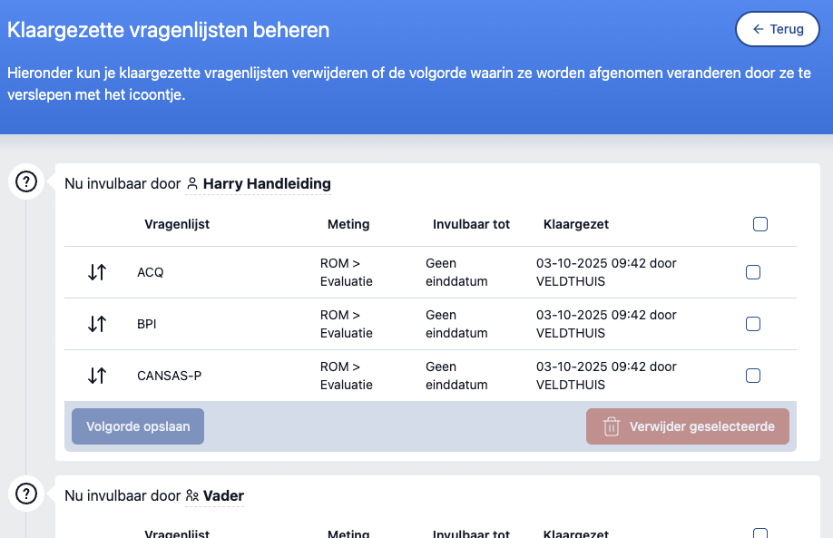 De volgorde waarin de vragenlijsten worden aangeboden nadat de respondent inlogt is dezelfde volgorde waarin ze in de tabel staan. Je kunt dit veranderen door rijen met het icoontje in de linkerkolom te verslepen, en daarna op de knop "Volgorde opslaan" te klikken.