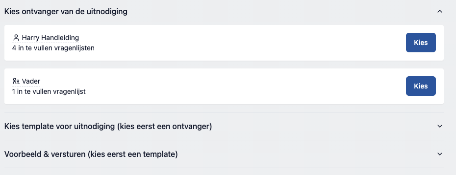 The first step is that you have to choose who you want to send the letter to. In this overview you can also see how many questionnaires are ready. You can also choose someone for whom no lists are ready. You can then download or print the letter as a PDF. However, it is never possible to send a letter by email when there is nothing to fill out at that time.
