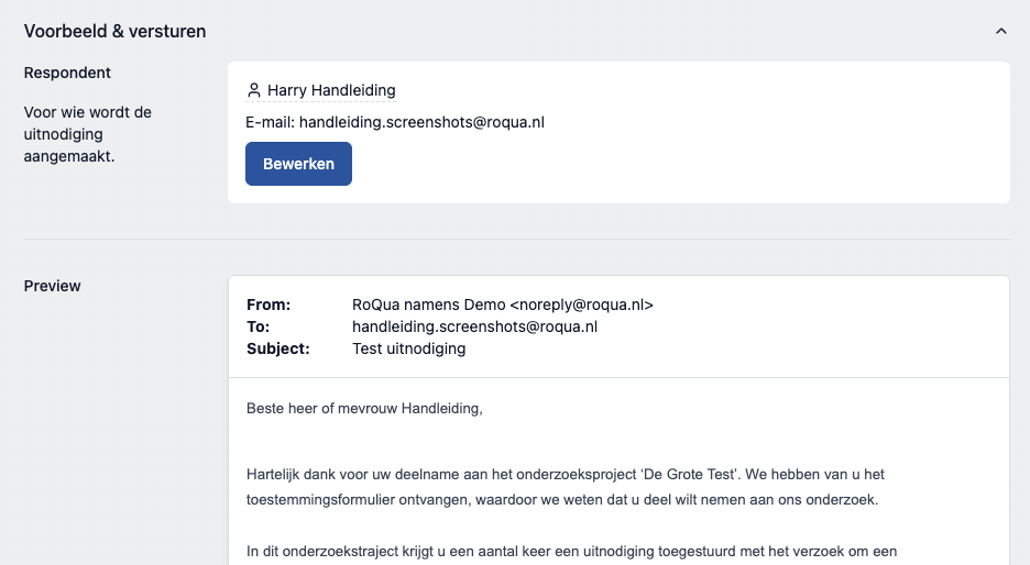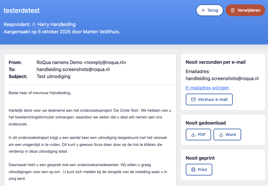 Normally you can create and send invitation letters at the same time as preparing questionnaires. However, it may be that this has not been done, and therefore RoQua also has a separate page to do this afterwards. This is under Menu -> Invitation letters.